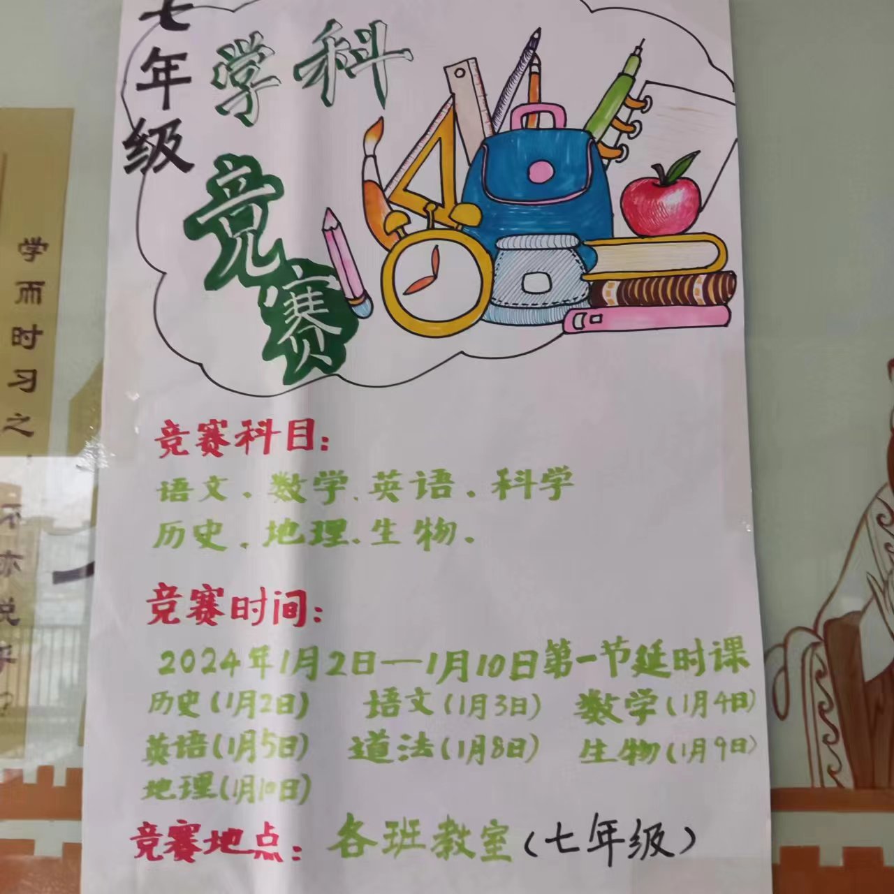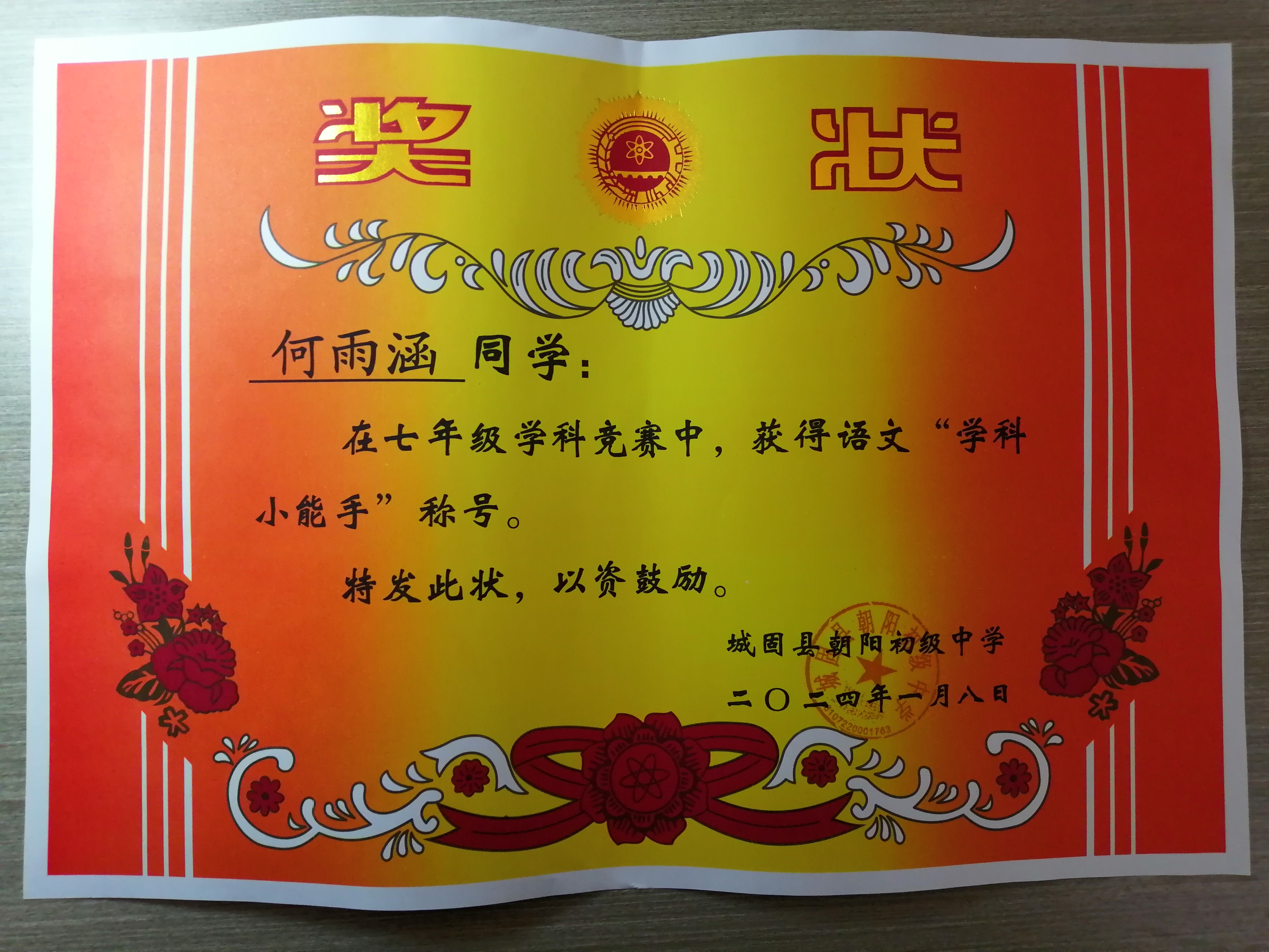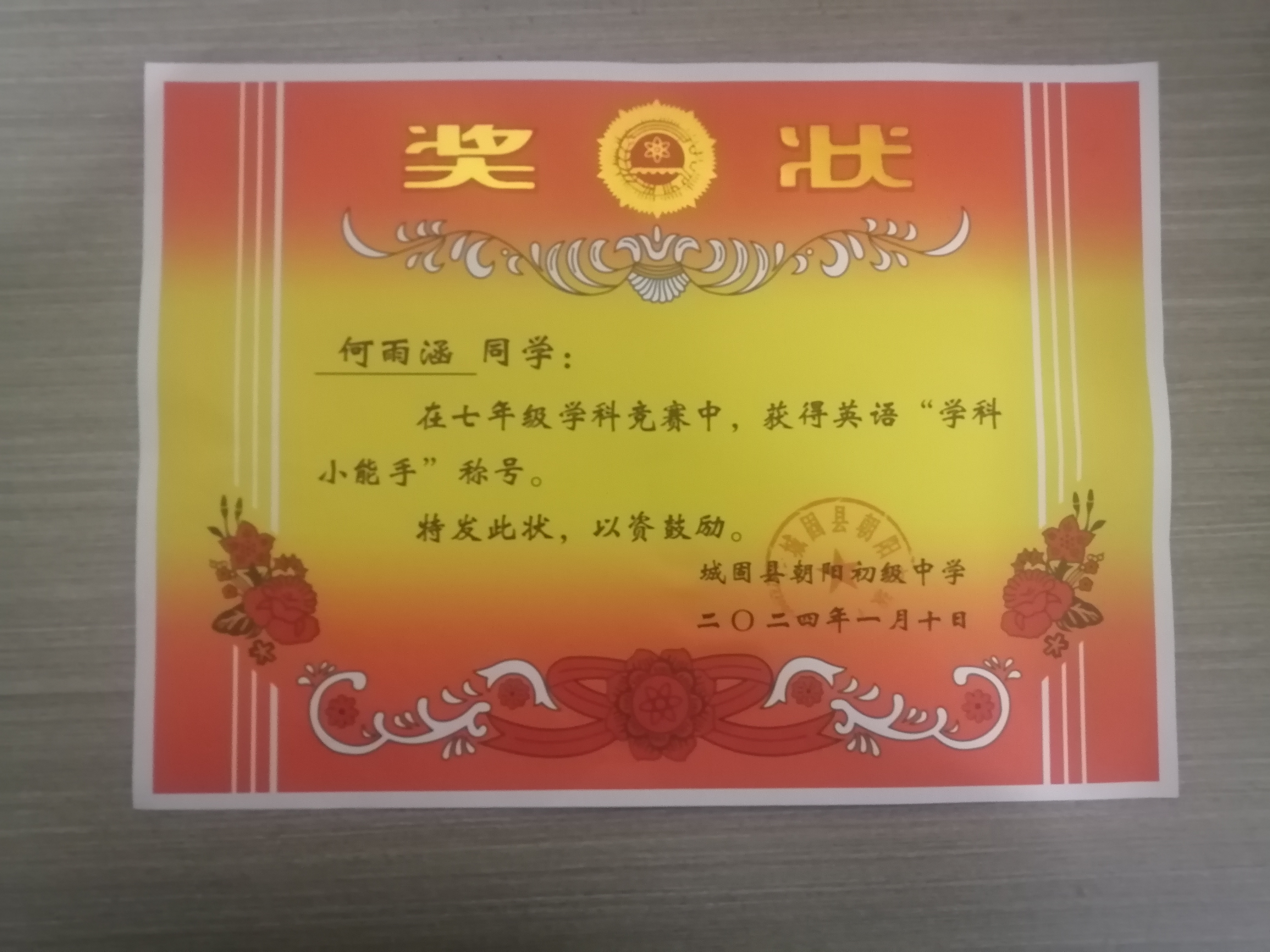 2024年1月2日 学校组织了七年级学科竞赛,我在其中获得了英语和语文的奖项,感谢我的英语和语文老师