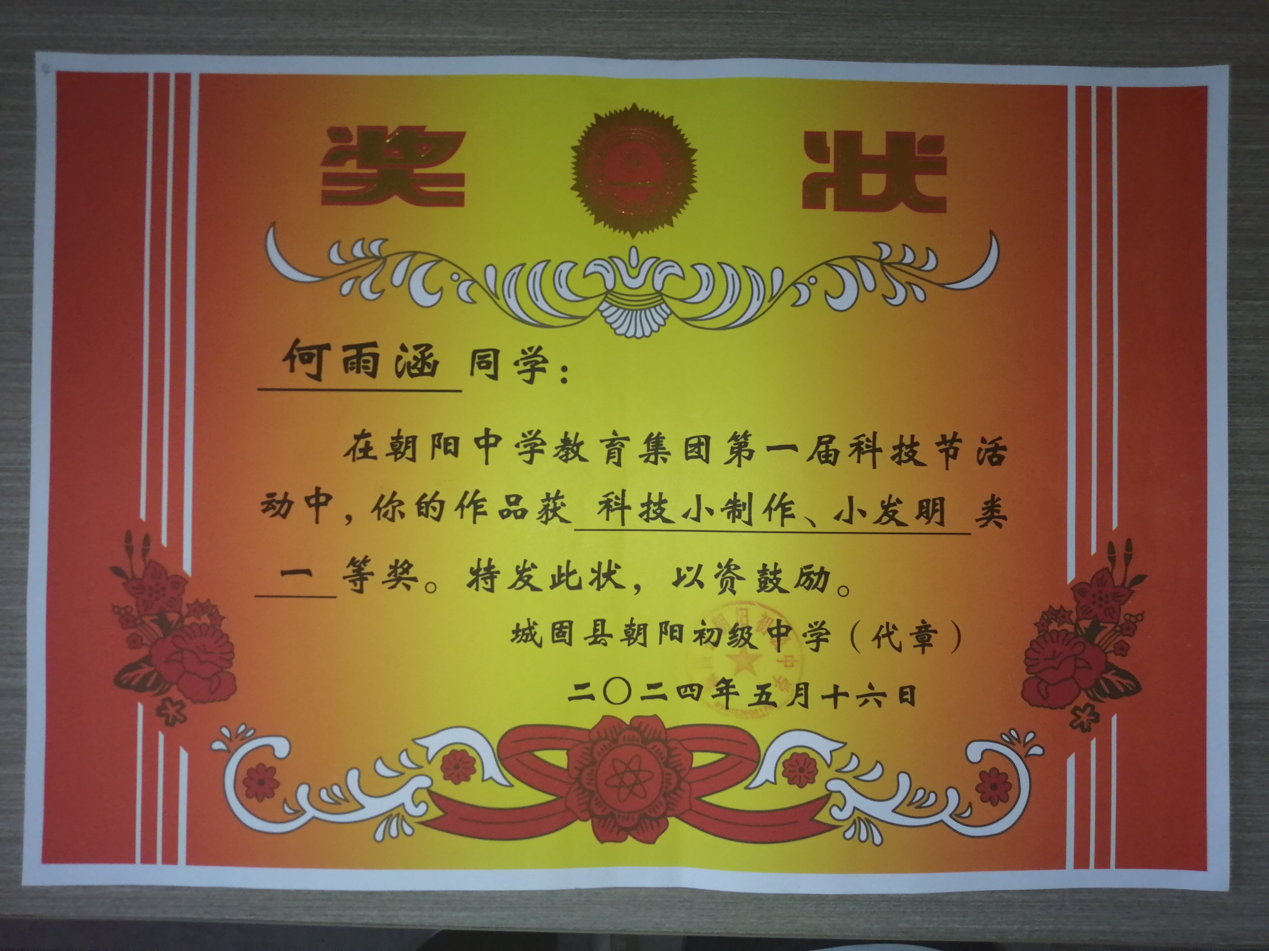 2024年7月1日 获得“科技小制作、小发明”一等奖