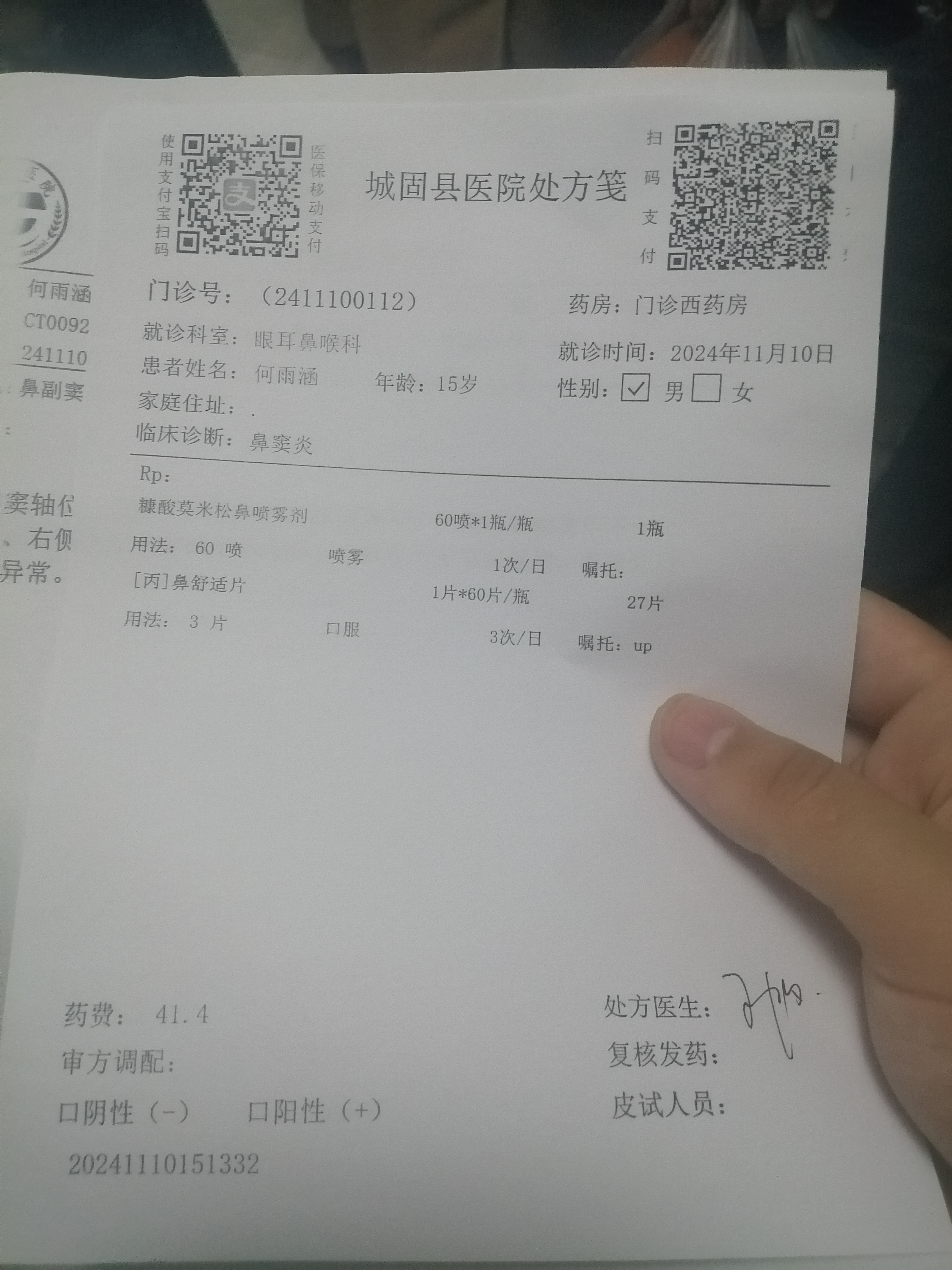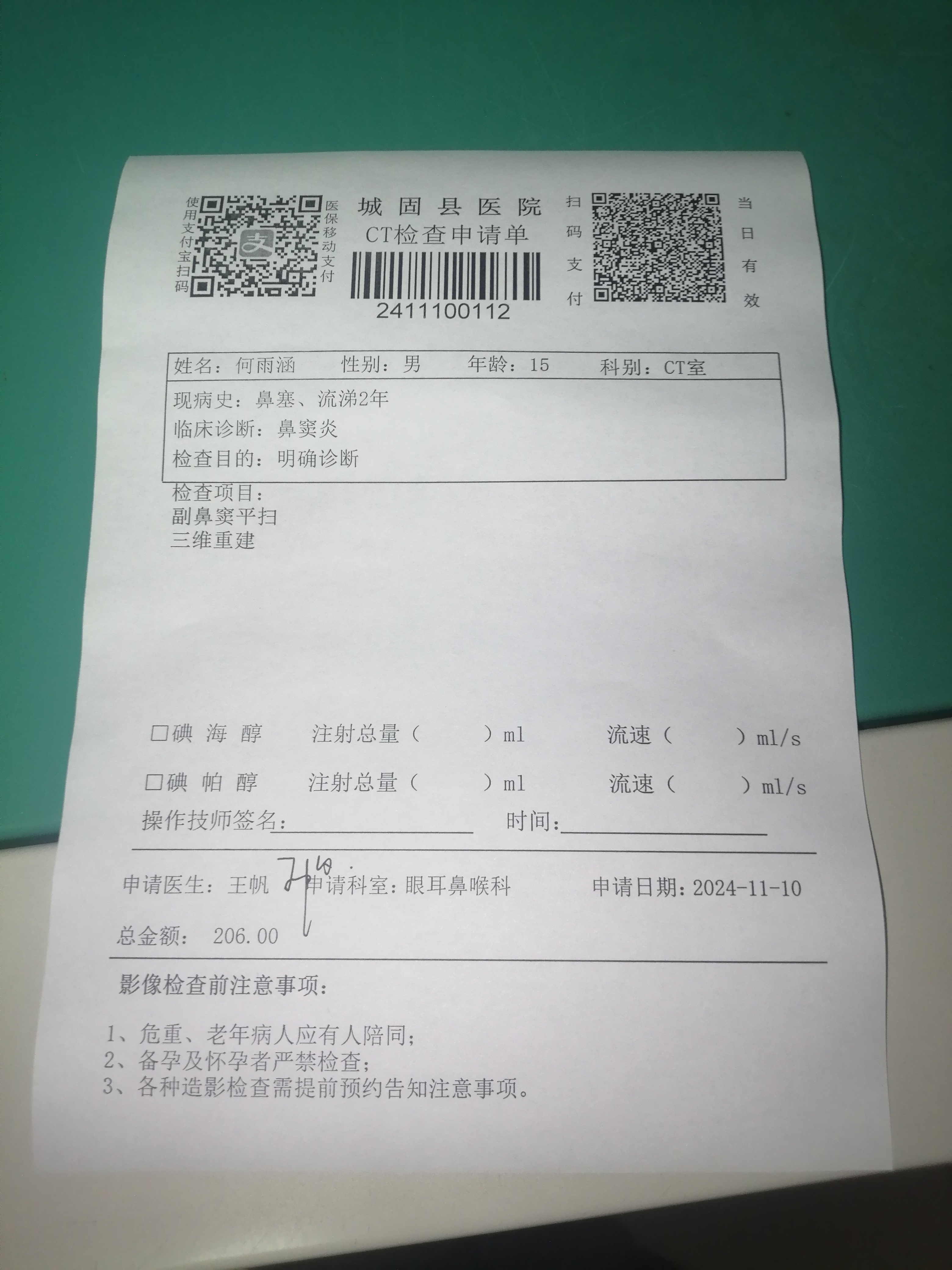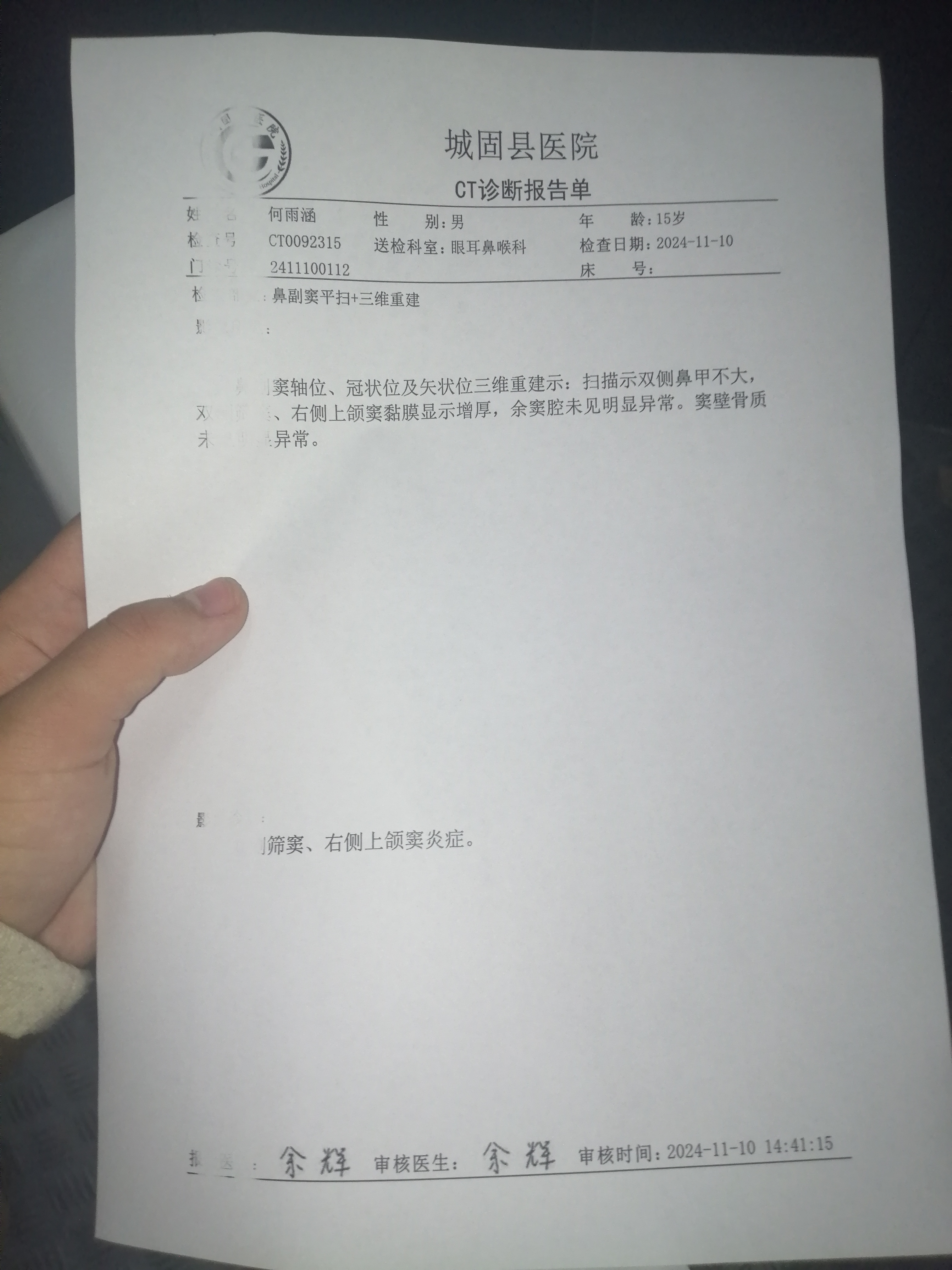 2024年11月10日 确诊鼻窦炎(轻度)