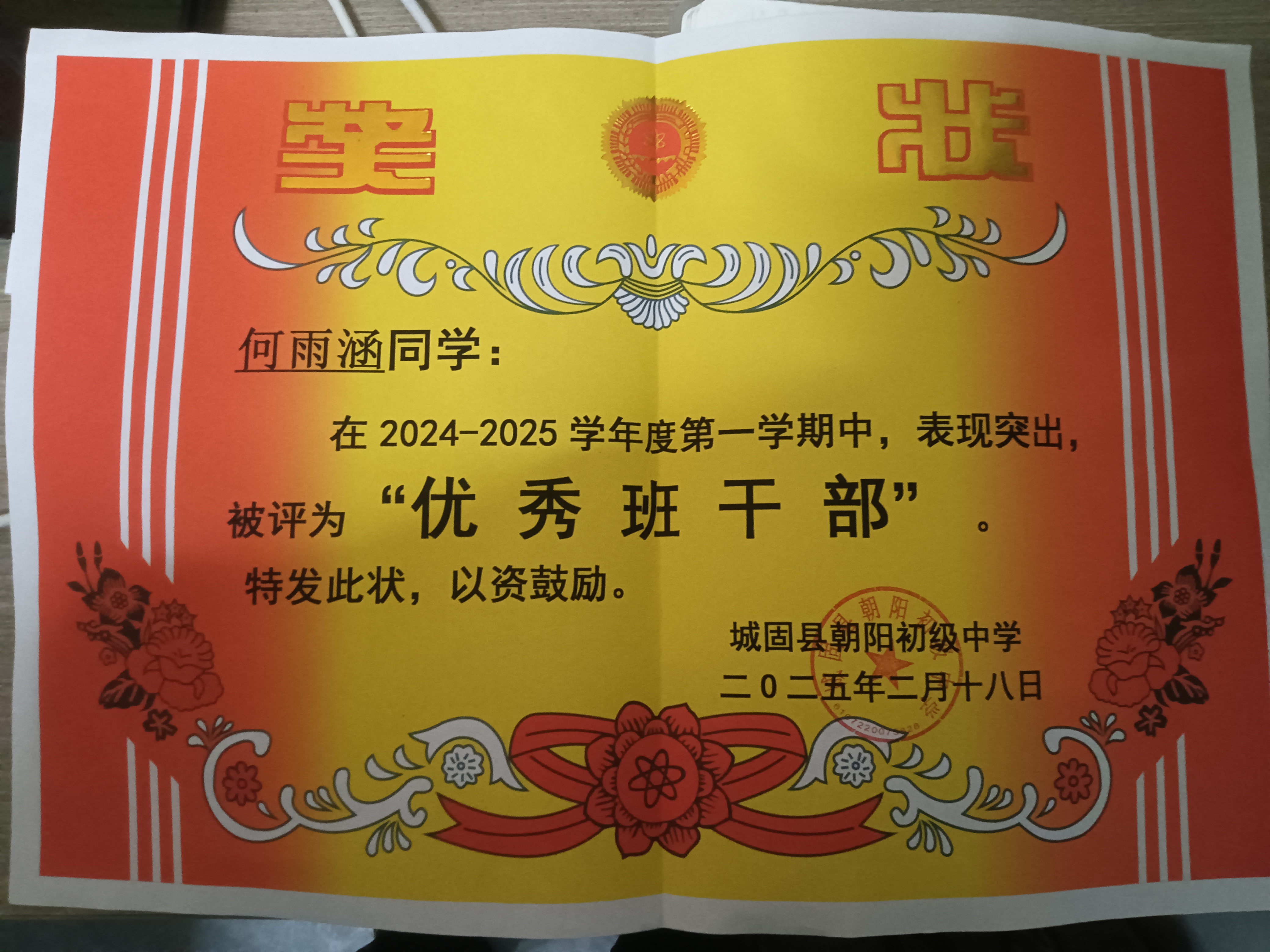 2025年2月25日 获得“优秀班干部(牛马)”奖状